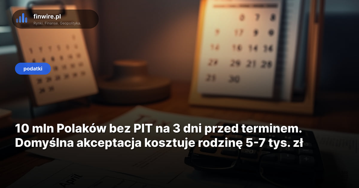Trzy dni przed terminem składania PIT-37 ponad 10 mln Polaków wciąż ma niezłożone zeznanie za 2025 rok. Dla rodziny z dwójką dzieci, dochodem gospodarstwa 19 tys. zł netto i kredytem hipotecznym 580 tys. zł pominięcie ulgi prorodzinnej i IKZE to realnie 5-7 tys. zł zostawione w urzędzie skarbowym. I to nie dlatego, że nie należy się zwrot - tylko dlatego, że Twój e-PIT zaakceptuje się sam o północy 30 kwietnia, nie dopisując żadnych odliczeń.