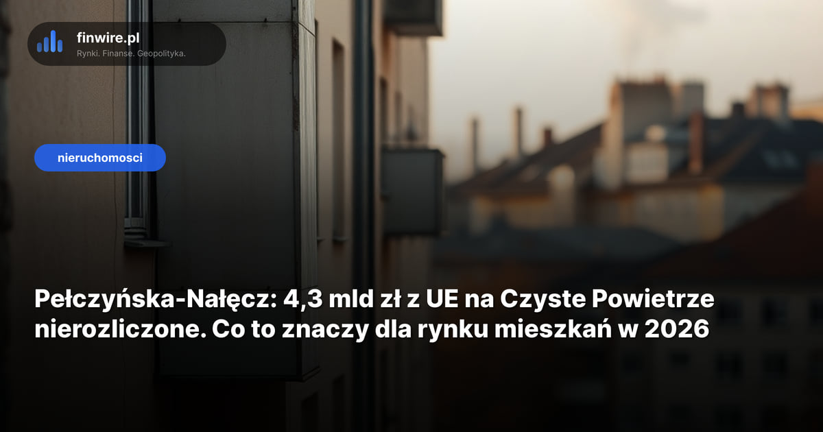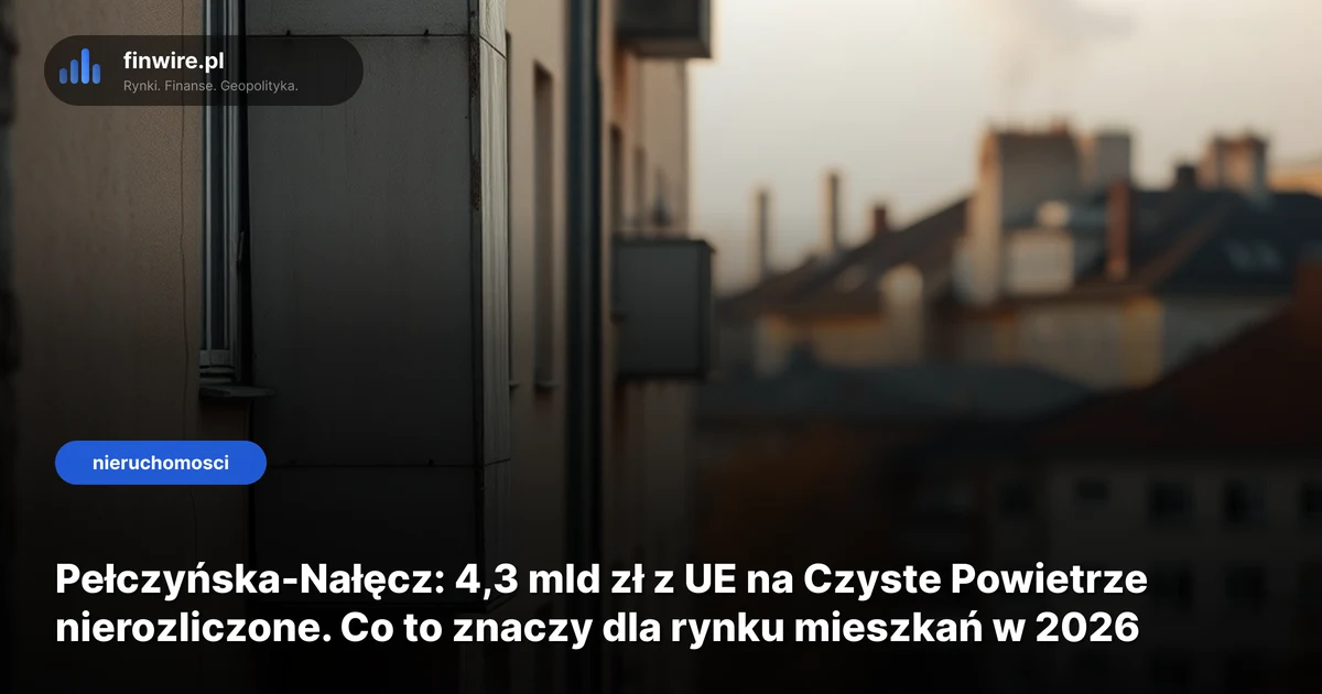 Z 4,3 mld zł z funduszy europejskich na program Czyste Powietrze nie rozliczono jeszcze ani złotówki, poinformowała w poniedziałek 27 kwietnia 2026 minister funduszy Katarzyna Pełczyńska-Nałęcz. Dla Piotra, który planuje kredyt 750 tys. zł na mieszkanie w Warszawie za około 1 mln zł, to sygnał: program, który miał poprawić efektywność energetyczną polskich budynków, stoi w miejscu, a starsze nieruchomości bez termomodernizacji mogą reagować na rynek inaczej niż lokale w nowych blokach. Stan na kwiecień 2026.