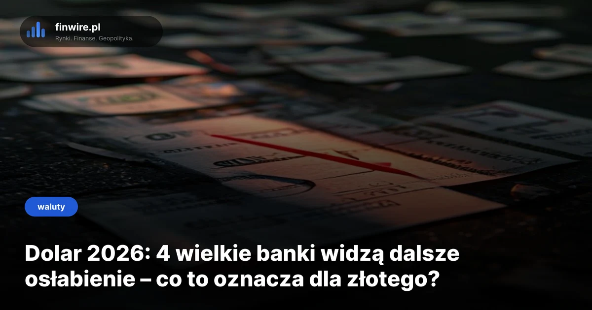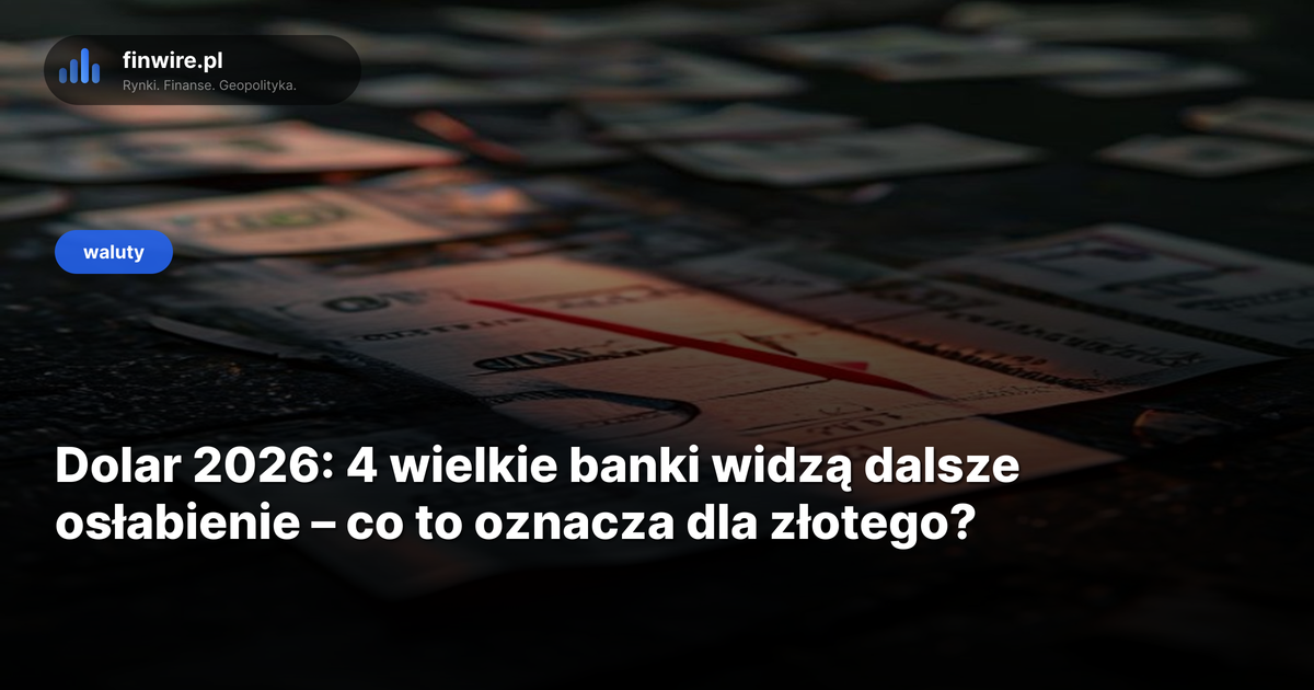 Indeks dolara (DXY) w połowie kwietnia 2026 oscyluje w okolicach 98–99 pkt – to poziomy niewidziane od wiosny 2022 roku. W ciągu ostatnich tygodni cztery duże banki inwestycyjne – Goldman Sachs, Deutsche Bank, JPMorgan i Saxo Bank – zaktualizowały prognozy walutowe, i wszystkie wskazują w tym samym kierunku: dolar będzie słabł.