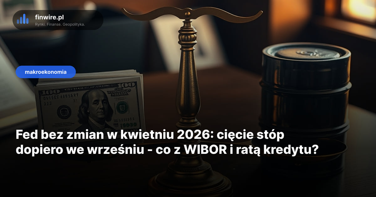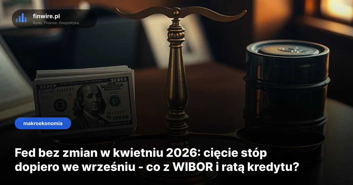 Fed pozostawił stopy procentowe w przedziale 4,25-4,50% na posiedzeniu 28-29 kwietnia 2026 r. - bez zmian czwarty miesiąc z rzędu. Rynek wycenia pierwszą obniżkę o 25 pb dopiero na 16 września, a wojna w Iranie i ropa Brent w okolicach 95 dol. za baryłkę odsuwają cykl luzowania o kolejne 4-5 miesięcy. Dla kredytobiorcy planującego hipotekę 750 tys. zł na 25 lat to dłuższe utrzymanie WIBOR 3M w okolicach 4,7% i rata 5 215 zł zamiast oczekiwanych 4 800 zł.