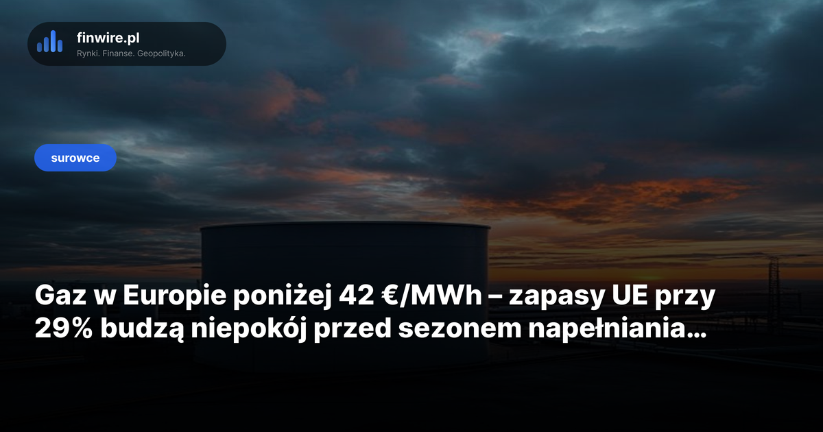 Ceny gazu spadają na fali rozejmu USA-Iran, ale fundamenty się pogarszają – magazyny UE startują sezon napełniania z deficytem 12 pp. względem normy. Tani gaz dziś nie oznacza taniego gazu zimą.