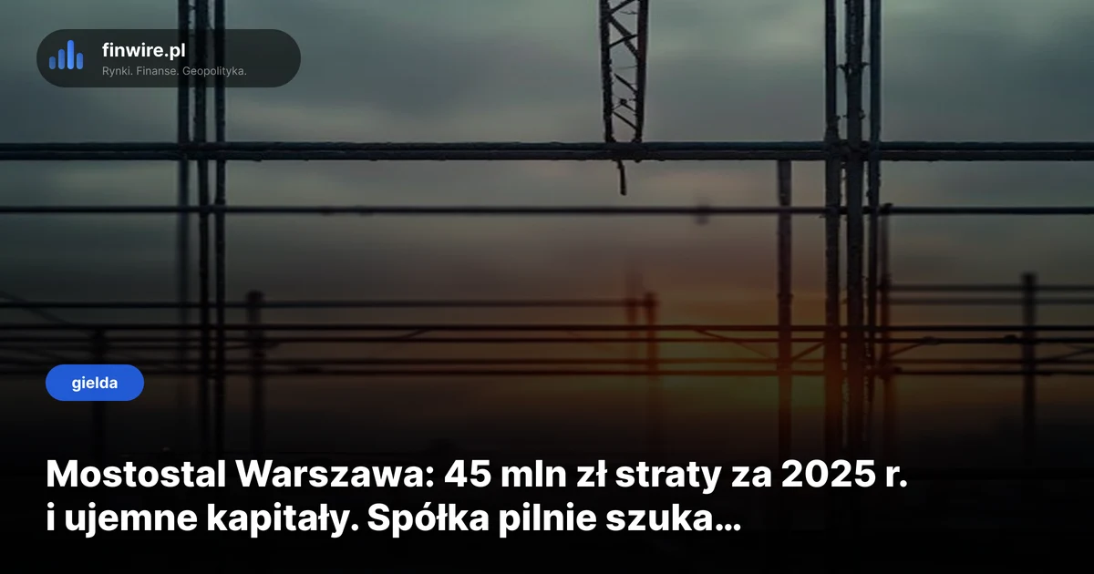 Mostostal Warszawa zamknął 2025 rok skonsolidowaną stratą netto 44 mln zł przy przychodach 1 363 mln zł - tak wynika z raportu szacunkowego ESPI 7/2026. Strata jednostkowa przypisana akcjonariuszom jednostki dominującej sięgnęła 45 mln zł. Na kwiecień 2026 r. zarząd otwarcie mówi o ryzyku dla dalszego funkcjonowania grupy.