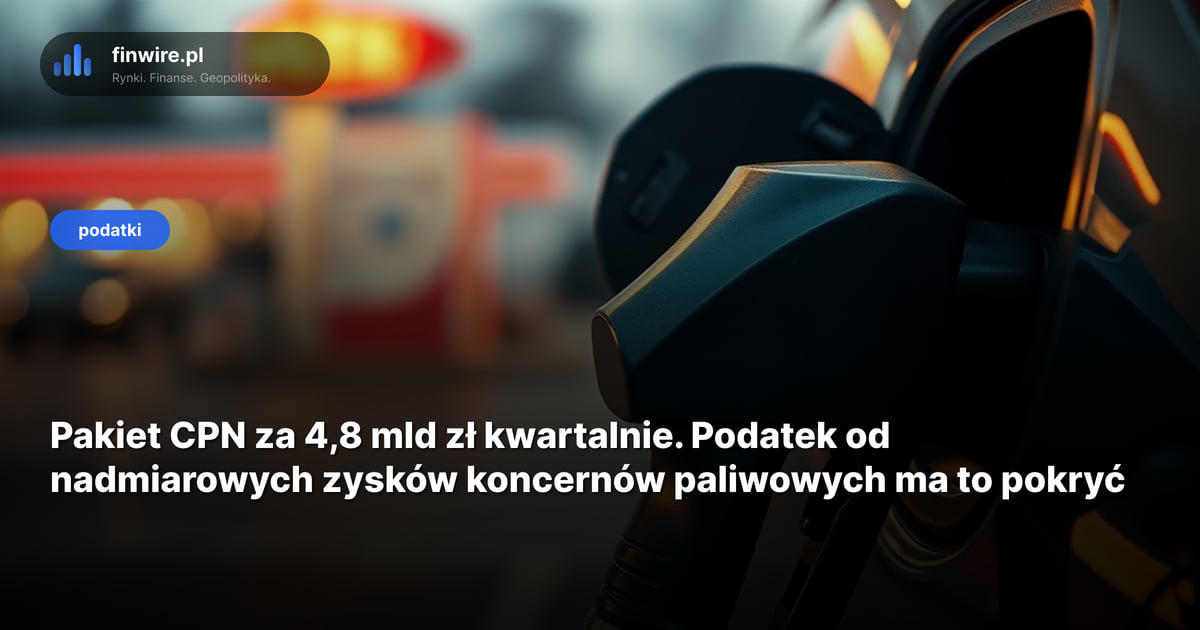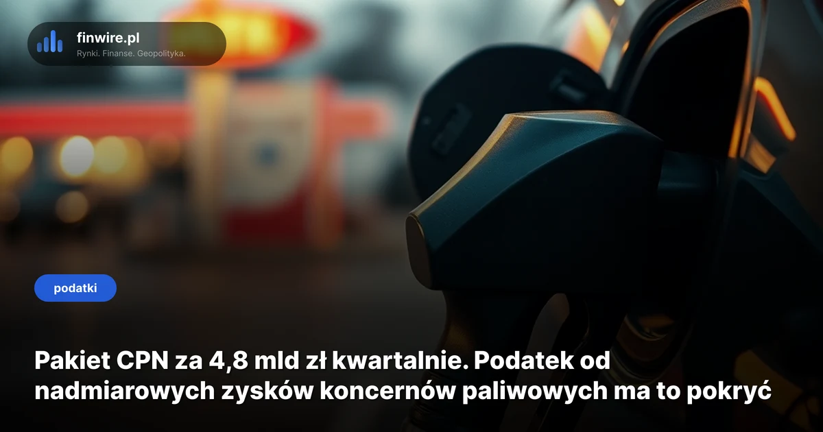 Premier Donald Tusk zapowiedział pod koniec marca 2026, że ubytek z pakietu CPN pokryje podatek od nadmiarowych zysków koncernów paliwowych. Projekt ustawy resort finansów finalizuje w kwietniu 2026, a celem jest skierowanie go do Sejmu przed wakacjami parlamentarnymi. Realny termin wejścia w życie - 1 sierpnia 2026.