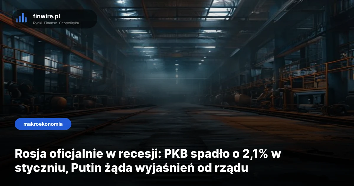 PKB Rosji spadło o 2,1% w styczniu 2026 r. w porównaniu z tym samym miesiącem rok wcześniej — to pierwszy spadek od 2023 roku. W pierwszych dwóch miesiącach roku gospodarka skurczyła się o 1,8%, a produkcja przemysłowa weszła w minus. Władimir Putin na posiedzeniu rządu 15 kwietnia zażądał wyjaśnień, dlaczego rzeczywistość tak dalece odbiega od prognoz Banku Centralnego i ministerstwa gospodarki.