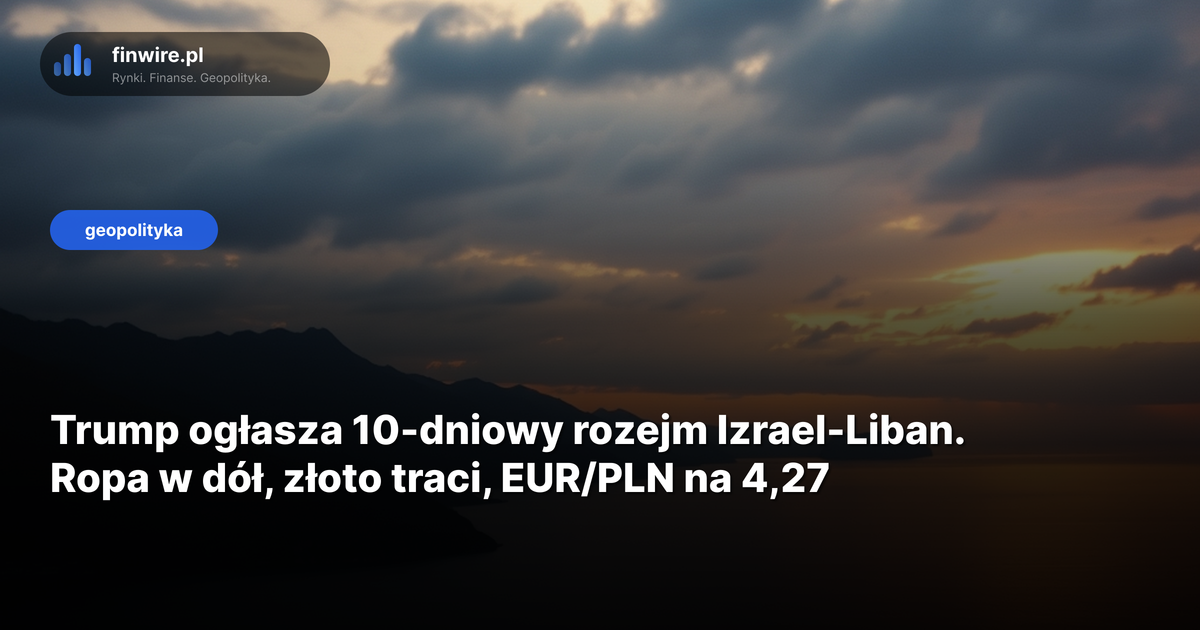 Izrael i Liban wstrzymają ogień na 10 dni - ogłoszenie padło z Białego Domu, nie z Bejrutu ani Tel Awiwu. Rozejm startuje o 23:00 czasu polskiego w czwartek. Ropa Brent od razu oddała 1,8% wg notowań ICE, a cena złota cofnęła się z rejonu 3 120 USD/oz.