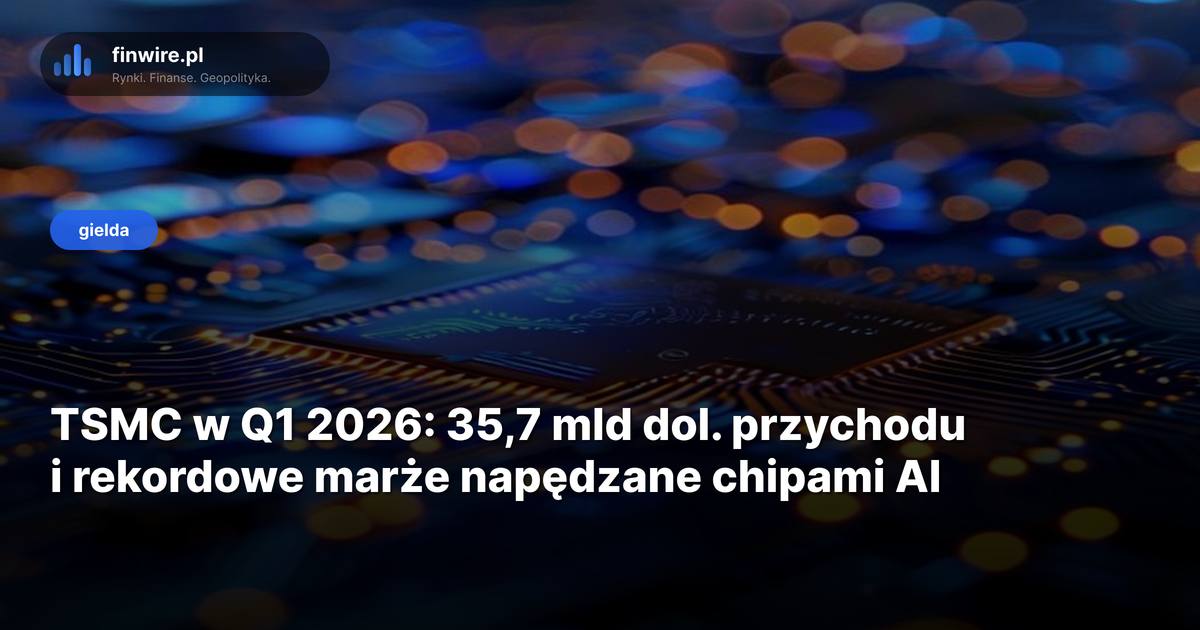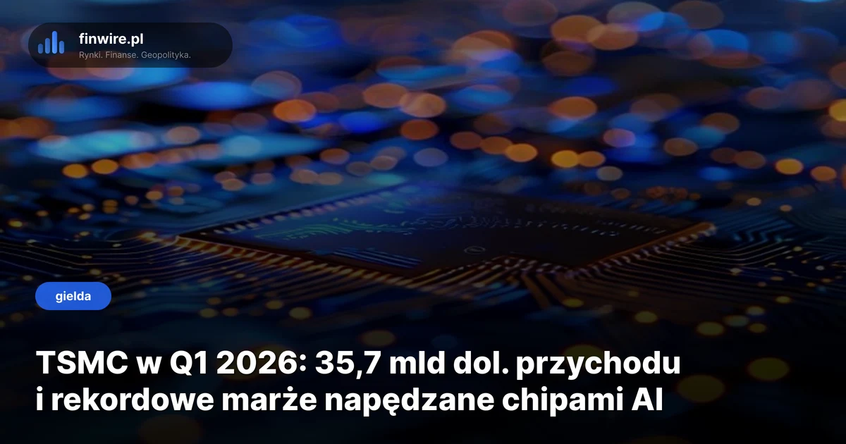 NT$1 134 mld przychodu w jednym kwartale. Tyle zarobiło TSMC w pierwszych trzech miesiącach 2026 roku - wynika z danych opublikowanych przez spółkę. W przeliczeniu na dolary to ok. 35,7 mld, czyli wzrost o 35,1% rok do roku. Stan na 16 kwietnia 2026 - dziś odbywa się konferencja wynikowa spółki.